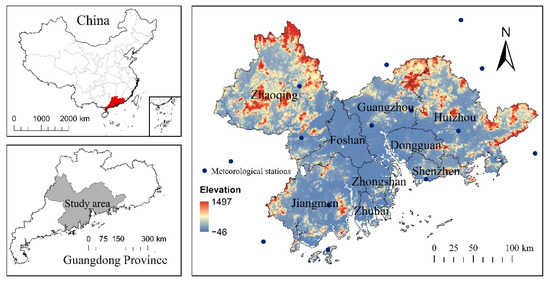 The PRD (112°45′–113°50′ E, 21°31′–23°10′ N) is located in the south-central part of Guangdong Province and the lower reaches of the Pearl River. It is adjacent to Hong Kong and Macao and faces Southeast Asia across the sea (Figure 1). The PRD has convenient land and sea transportation and a basin area of 450,000 km2. It consists of nine prefecture-level cities, namely, Guangzhou, Shenzhen, Zhongshan, Zhuhai, Dongguan, Zhaoqing, Foshan, Huizhou, and Jiangmen.