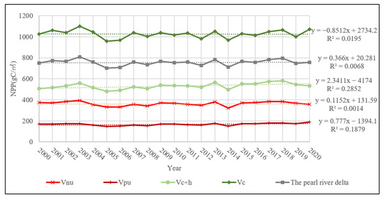 The annual partition statistics of NPP in , , , and are shown in Figure 6. The two main results are as follows: (1) The region affected only by climate had the strongest carbon sequestration capacity, whereas the carbon sequestration capacity of other regions was lower than the average of the PRD. The average NPP values of , , , and differed significantly, and were in the order of >>>. (2) The average growth trend of NPP in the four types of regions was clearly different. The average growth rate of NPP in the PRD was 0.37 g C/(m2·y), second only to with the highest growth rate of NPP (2.34 g C/(m2·y)), whereas had the lowest growth rate (−0.85 g C/(m2·y)) despite having the highest NPP value. This is consistent with the results shown in Figure 6. The NPP growth rate of (0.11 g C/(m2·y)) was less than that of (0.78 g C/(m2·y)). The results indicate that more attention should be paid to the change in carbon sequestration capacity of , and human intervention should be used to reduce the decline in NPP in climate-only regions. In urban areas, it is necessary to speed up the implementation of carbon sequestration measures in newly added cities and to implement more efficient carbon sequestration policies while increasing NPP values.