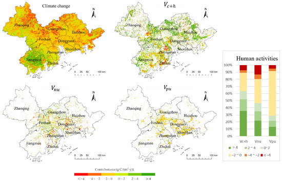 Figure 7 shows the total contribution of climate change to NPP in the PRD and divides the contribution of human activities into three parts, namely, , , and . Climate change makes a negative contribution to NPP and is related to reduced sunshine duration, excessive precipitation, and reduced temperature. In parts of the southwest PRD, such as Jiangmen, Zhaoqing, and Zhuhai, climate change has contributed to the growth of NPP. In addition, the contribution of human activities to NPP varies substantially within and outside urban land. In , which is affected by both climate and human activities, the positive contribution of human activities to NPP was more than 60.00%, and the contribution value greater than four reached 35.54%. In most areas of urban land, the contribution of human activities to NPP was negative. The positive contribution of human activities to NPP in (46.60%) was higher than that in (28.75%), but the negative contribution range of less than −2 in (19.70%) was also higher than that in (8.30%). This indicates that NPP in new cities is more sensitive to human activities, whereas the positive and negative contributions of human activities to NPP in permanent cities are weak.