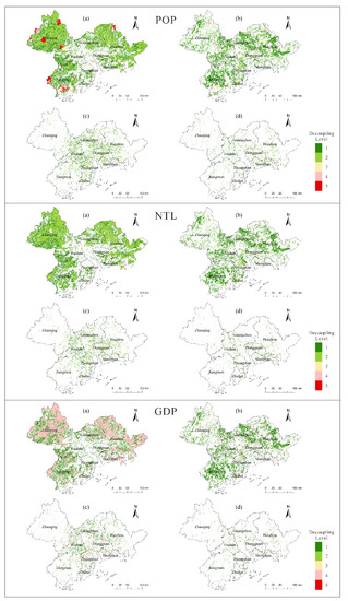 Decoupling between socioeconomic factors (POP, NTL, and GDP) and net primary productivity (NPP) in (a) , (b) , (c) , and (d) .