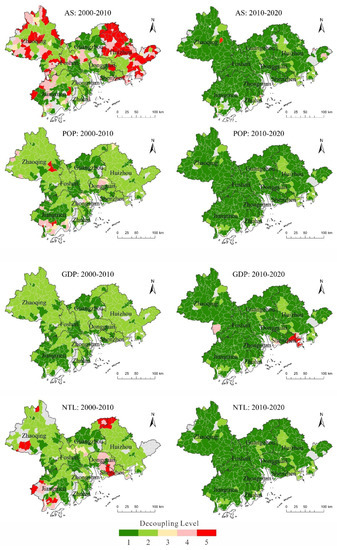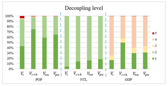 NTL can reflect human economic activities, and its decoupling relationship with NPP is shown in Figure 8. Combined with Figure 10, it can be seen that although the area of level 1 decoupling between NTL and NPP was considerably smaller than that of POP during the study period, the area of level 2 decoupling accounted for more than 80%. The total area of levels 1 and 2 decoupling was greater than 99.9%, indicating that human economic activities and carbon sequestration capacity in almost the entire PRD are in a relatively coordinated development process. Outside urban land, the decoupling relationship between NTL and NPP in was better than that in . Within the urban land range, the decoupling relationship between NTL and NPP in was slightly worse than that in . In and , the proportion of the levels 1 and 2 decoupling relationship was larger than that of and , indicating that the coordinated development of economic activities and carbon sequestration capacity within the PRD is better than that outside the city.