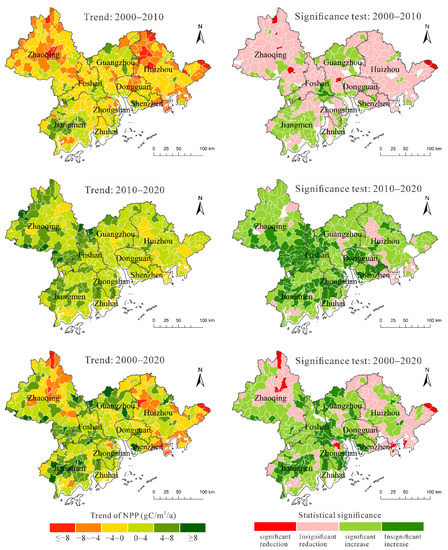 Net primary productivity (NPP) trends of , , , and from 2000 to 2020.