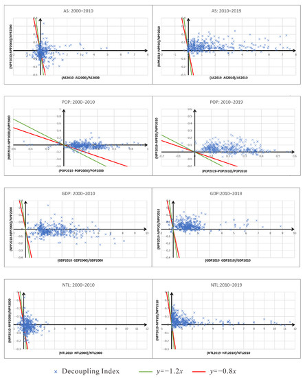 The complex urbanization process and human activities are quantified by POP, NTL, and GDP. The decoupling relationship between these three social and economic factors and NPP is shown in Figure 8 and Figure 9 to reflect the dependence of urban development on NPP.