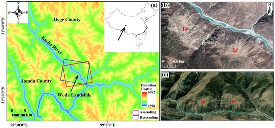 The study area is the Woda village and its surrounding areas in the upper reaches of the Jinsha River. The Woda village is located in Yanbi Town, Changdu City, Tibet, China, with a longitude of E and latitude of N (Figure 1a). There are two closely distributed landslides in the area, named landslide bodies 1 and 2, along the Jinsha River (Figure 1b). The front edges of the landslides are steep and reach the Jinsha River valley at the toe, but the middle and rear parts are relatively flat (Figure 1c). The elevation of the Jinsha River surface is about 2950 m, and that of the trailing edge apex of the landslide area is about 4000 m. Such a great elevation difference may contribute to geological disasters, such as large-scale landslides, for example, the Baige landslide, which blocked the main stream of the Jinsha River to form a dammed lake, causing huge property losses.