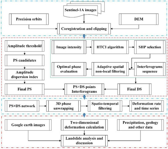 The flowchart of landslide monitoring by the DS-InSAR method.