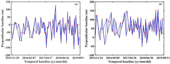 Spatial and temporal baselines of the interferograms obtained by (a) ascending data; (b) descending data.