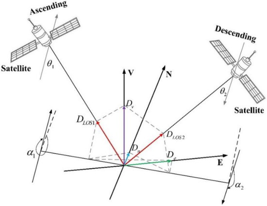 According to the geometric relationship of radar imaging, the surface deformation monitored by the ascending and descending SAR images were both in the LOS direction (). can be decomposed into the deformation in the vertical (), east–west (), and north–south () directions (Figure 4).