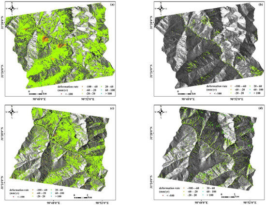 The LOS deformation rate maps of the Woda landslide area (a) derived from ascending data using the DS-InSAR method; (b) derived from ascending data using the PS-InSAR method; (c) derived from descending data using the DS-InSAR method; (d) derived from descending data using the PS-InSAR method.