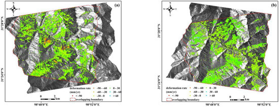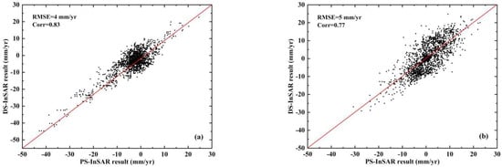 Correlation between PS-InSAR and DS-InSAR deformation rates in the (a) ascending orbit and the (b) descending orbit.