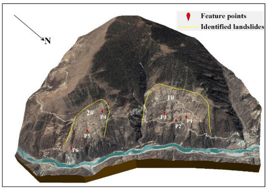 After analyzing and verifying the deformation rate results, we analyzed the time series deformation in the landslide area to understand the surface deformation characteristics more comprehensively. Figure 8 is a three-dimensional optical image feature map of the landslide area. The yellow curves outline the identification boundaries of the two landslide bodies 1 and 2. Considering the geomorphology and slopes, we selected three points from each landslide body and analyzed their time series deformation trends to understand the law of surface change in the landslide area.
