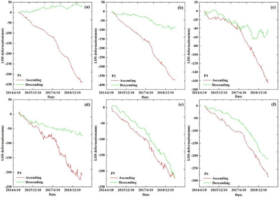 Time series deformation of points P1–P6 (a–f) based on ascending and descending results.