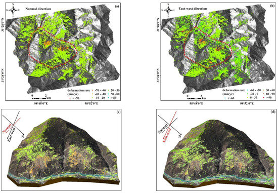 Two-dimensional deformation results (a) in the normal direction and (b) in the east–west direction. Three-dimensional model of the deformation (c) in the normal direction and (d) in the east–west deformation.