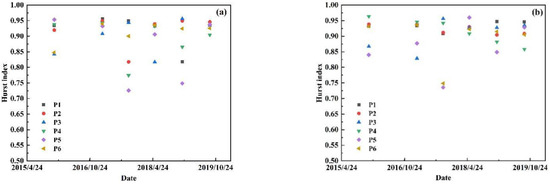 From Table 3 and Figure 12a we found that, in the normal direction, the Hurst index of each feature point is greater than 0.5 at each segment, indicating that the time series deformation results have a long-term correlation. From 10 February 2017 to 26 September 2017, the Hurst index values of each feature point are low, and the Hurst index values of P2, P4, and P5 are all lower than 0.9, which is a little lower than the results of the other periods and also confirms the acceleration trend of deformation after the precipitation peak in 2017 obtained in the previous study. From 7 January 2019 to 4 September 2019, the Hurst index value of each feature point is greater than 0.9, indicating that the normal direction deformation trend will continue for some time. From Table 4 and Figure 12b, we found that in the east–west direction, the Hurst index calculated at each feature point is also greater than 0.5 at each segment, indicating that the time series deformation results have a long-term correlation. From 10 February 2017 to 26 September 2017, the Hurst index values of P5 and P6 are obviously relatively low, at 0.736 and 0.748, respectively, while the other points are greater than 0.9. From 7 January 2019 to 4 September 2019, the Hurst index value of P4 is 0.858, and those of the other points are all above 0.9, indicating that the east–west deformation trend will continue for some time.