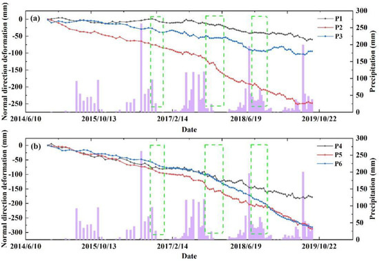 Time series deformation in the normal direction and precipitation distribution map of the P1–P6 feature points. (a) includes P1–P3 feature points; (b) includes P4–P6 feature points. The green dashed boxes are the deformation trend of the feature points after the period of concentrated precipitation.