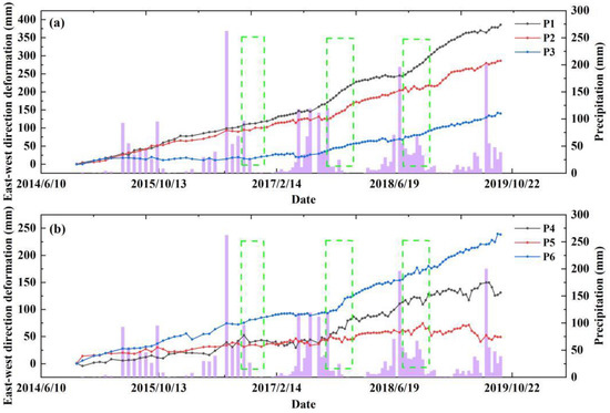Time series deformation in the east–west direction and precipitation distribution map of the P1–P6 feature points. (a) includes P1–P3 feature points; (b) includes P4–P6 feature points. The green dashed boxes are the deformation trend of the feature points after the period of concentrated precipitation.