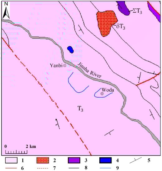 Geological map of the study area. (1) Upper Triassic; (2) Upper Triassic diorite; (3) Upper Triassic ultrabasic rock blocks; (4) diorite vein; (5) stratigraphic occurrence; (6) actual blatt flaws; (7) supposed blatt flaws; (8) stratigraphic boundary; (9) identified landslides.