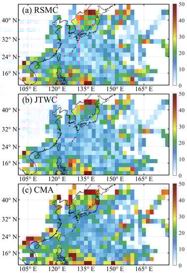 - Song, J.-J.; Wang, Y.; Wu, L. Trend discrepancies among three best track data sets of western North Pacific tropical cyclones. J. Geophys. Res. 2010, 115, D12128. [Google Scholar] [CrossRef]