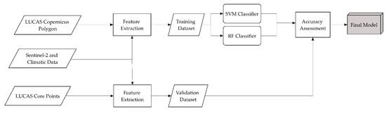 To evaluate the potential of S2 time series for the production of detailed LULC maps, this manuscript reports on the potential of the LUCAS 2018 data to derive detailed EU-wide crop type maps at 10 m spatial resolution based on a spatially and temporally harmonized S2 time series. As different classification algorithms often yield different results [23], this research also includes a comparison between support vector machine (SVM) and random forest (RF). Both methods are relatively insensitive to noise and overtraining, and they can deal with imbalanced data [24]. To compare the results of this research to previous findings, the classification scheme used by [22] was also adopted here.
