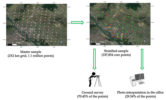 The smallest area of observation is a circle with a 1.5 m radius. About 70% of core points were surveyed on the ground, and the rest were photo-interpreted in the office (Figure 3). The land cover of these points was labeled according to three different classification schemes. The level-1 legend includes eight broad land cover groups, while level-2 and level-3 comprise detailed classes with 26 and 66 categories, respectively [34].