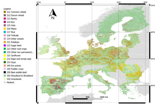 Noteworthy, d’Andrimont et al. [22] derived a 10 m crop type map with S1 data from 28 member states of Europe (EU-28). The study presented a relatively precise and detailed land cover map (19 specific crop type classes beside two broad classes) using a random forest (RF) classifier. Data from the LUCAS Copernicus module (using the polygon geometries) were exploited for training, while the validation was based on an independent set of 87,853 high-quality points filtered from LUCAS core points. The overall accuracy was 74.0% for the 21 classes. The accuracy increased to 79.2% when the classes were grouped into eight broader classes. To date, however, the full potential of S2 data to obtain detailed crop type maps (as the 19 crop types identified in [22]) has not yet been demonstrated.