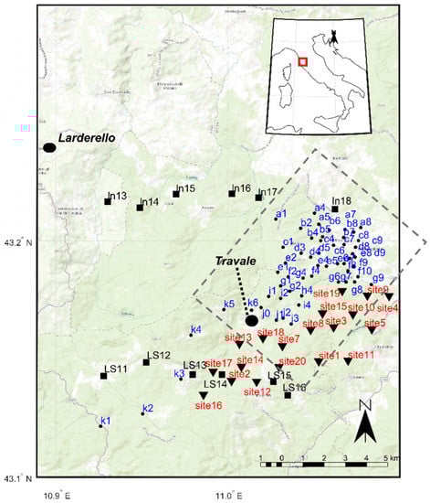 The Larderello-Travale geothermal area. The 86 MT sites are located in the study area around Travale and were acquired during three different MT campaigns in 1992 (black-labeled sites), 2004 (blue-labeled sites), and 2006–07 (red-labeled sites). Only a subset of 51 sites belonging to the 2004 dataset were selected for 3D inversion because of their low level of noise, similarity of the period range, and the regular spatial distribution of the site locations. The dashed box represents the central area of the 3D model mesh.