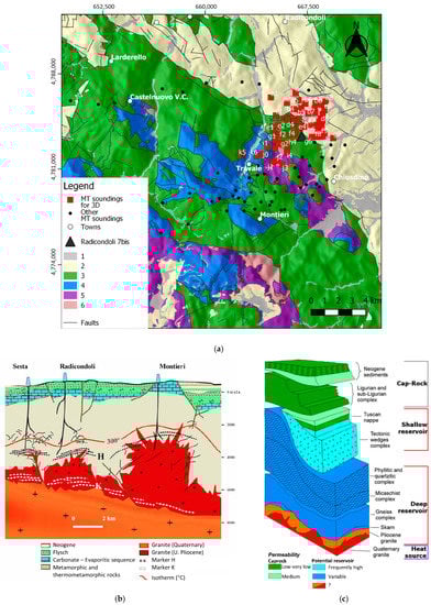(a) Simplified geological map of the area of study: (1) Quaternary deposits, (2) Neogene sediments (Miocene–Pliocene), (3) Ligurian and sub-Ligurian flysch complex (Jurassic–Eocene), (4) Tuscan Nappe sediments (Late Triassic–Early Miocene), (5) Tuscan Nappe: basal evaporites (Late Triassic), (6) Metamorphic units (Triassic–Paleozoic). The red squares are the 51 sites selected for MT inversion. Radicondoli7bis is the well shown in Figure 13. The black curves are the main faults []; (b) Schematic conceptual model of the Travale area with NW-SE orientation where seismic horizons H and K are indicated (modified from []); (c) Schematic sketch of the tectono-stratigraphic and hydrogeological complexes of the LTGA (modified from [,]).