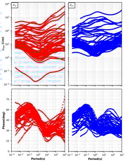 Cloud plot of the observed off-diagonal apparent resistivity (top) and phase (bottom) at 51 sites selected for 3D inversion. The rotation of the impedance tensor is zero. xy-mode is plotted in red and yx-mode in blue without data errors. The phases are shifted in the first quadrant. The curves in the plot are raw data without any correction or rotation.