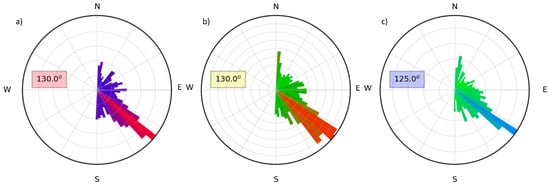 Rose diagrams of the strike direction calculated over the whole period range from (a) the impedance tensor Z, (b) the phase tensor azimuth, and (c) the tipper vector. The color of the bars depends on the number of occurrences in each histogram bin and goes from purple to red for the invariants (a), from green to orange for the phase tensor (b), and from green to blue for the tipper (c).