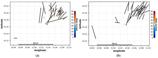The geomagnetic transfer function, also known as the tipper, represents the ratio between the vertical and horizontal components of the magnetic field. Figure 5 shows the tipper vectors (or induction arrows) of the subset of 26 sites (out of 51) whose vertical transfer function has been measured. The color scale of the ellipses ranges from 0° to 90° and refers to the phase-tensor determinant. It deviates from an angle of 45° if there is no 1D regional distribution in the subsurface. For the selected periods of 1 and 10 s (Figure 5a,b, respectively), the induction arrows present a substantial agreement with the strike direction shown in Figure 4 since they are orthogonal. We adopted the Parkinson criterion to represent the induction arrows, which point toward the region of highest conductance. The vectors suggest a possible NW-SE-oriented conductive region (in line with the phase-tensor ellipses shown in Supplementary Material, Part A).