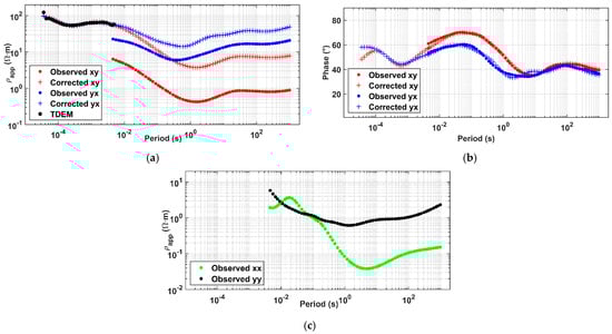 Static shift correction for site a1 using PSO: (a) The dots are the observed apparent resistivity (ρapp) of TDEM (black) at short periods (up to 0.005 s) and of xy and yx MT (red and blue, respectively) from 0.003 s upward. The red and blue crosses indicate the predicted MT ρapp (xy and yx, respectively) that correct the static shift according to TDEM information; (b) Observed (dots) and predicted (crosses) xy and yx phases; (c) The diagonal apparent resistivity xx (green dots) and yy (black dots).