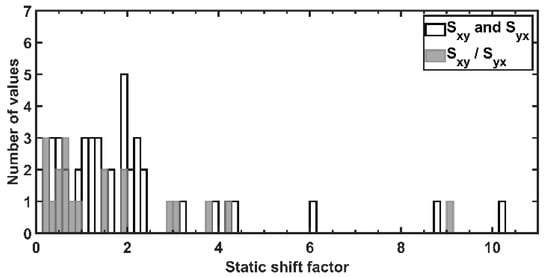 Histograms of the static-shift factors Sxy and Syx (white bins) and their ratio Sxy/Syx (grey bins).