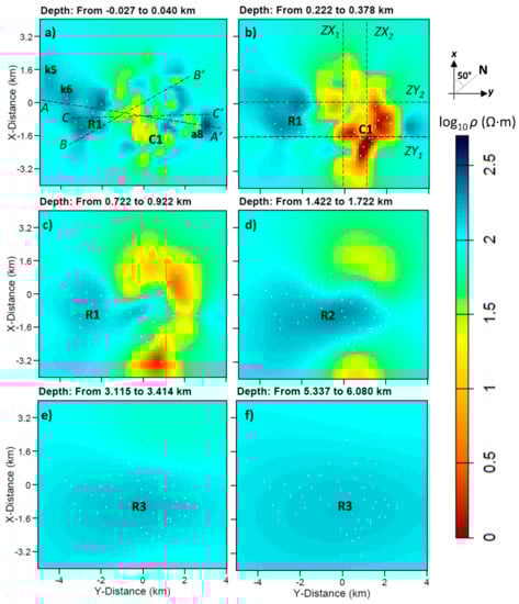 The 3D resistivity model obtained is shown in Figure 8, Figure 9 and Figure 10. (The figures have not been smoothed, but represent the original cell-by-cell visualization.) Figure 8 shows the resistivity distribution in the horizontal plane at six different depths (27 m a.s.l., 222 m, 722 m, 1.4 km, 3.1 km, and 5.3 km b.s.l.) as they reveal the most evident resistivity contrasts of the imaged model. In the shallow structures (Figure 8a,b), we observe a clear difference between the northeastern conductive region roughly oriented NW-SE (<10 Ω·m), hereafter C1, and the southwestern region, hereafter R1, where the resistivity rises by up to 300 Ω·m. From 1 to 2.5 km b.s.l., the resistivity increases up to 180 Ω·m in a resistive body (R2 in Figure 8d). Below a depth of 3 km (Figure 8e,f), a resistive body of maximum 140 Ω·m, hereafter R3, elongates orthogonally to the strike (i.e., in parallel to the y-axis).