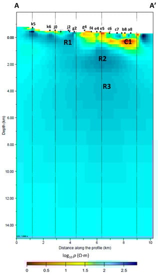 The vertical section of the 3D model in Figure 9 crosses the sites belonging to the 2D profile investigated by []. The resistivity distribution of the 3D model is partially similar to that of the 2D model, but some features emerged from the 3D inversion. The shallow structure R1 (up to 1 km b.s.l.) beneath sites k5–j2 is far more resistive (300 Ω·m) than in the 2D model. Beneath sites g4–a8, from 1 to around 3 km b.s.l., the 3D model has a resistive region R2 (180 Ω·m) rather than a conductive anomaly as seen in the 2D model. The resistive body R3 at 3–8 km b.s.l. has a different shape, boundaries, and resistivity values compared to the 2D model. Given all these dissimilarities, our result overcame the main limitations of the 2D model, which could have been strongly biased by its chosen a priori geological cross-section starting model. Moreover, the 2D model might have missed some heterogeneities due to the adoption of a 2D approach for the inversion of 3D data.