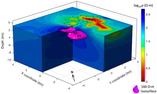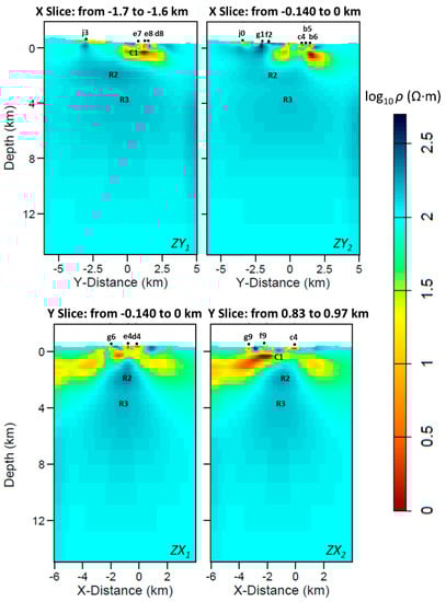 The vertical cross-section depicted in Figure 9 is directly comparable with the 2D model of []. The most important feature between the depths of 3 and 8 km is a large 140-Ω·m body (R3). The R3 body extends orthogonally to the strike direction, as imaged also in the horizontal view of Figure 8e–f. Figure 10 shows the vertical cross-sections along the ZY and ZX planes (the traces of these sections are marked in Figure 8b).