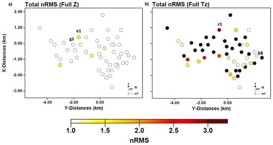 The RMSE of 1.12 can be appreciated from Figure 11a,b, which plots the distribution of the RMSE in the frequency–space domain for Z and T, respectively. The final RMSE normalized for the full period bandwidth was 0.87 for Z and 1.5 for T. The lowest RMSE for Z was measured in site g1 (0.5) and for T in site b8 (0.6). The worst RMSE resulted in site e1 (1.4) for Z and in site c1 for T (3.4).