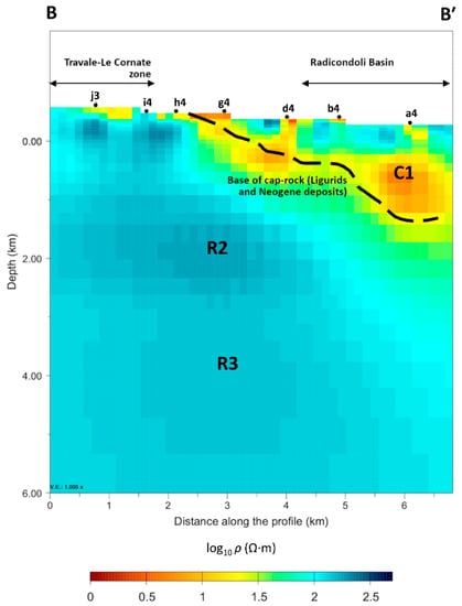 Interestingly, we found a resistivity contrast in correspondence with the bottom of the Ligurian units (and Neogene sediments) of the Radicondoli basin, separating them from the underlying units piled in the chain (from []). Figure 12 shows a north–south section of the model crossing sites from a4 to j3. The geological surface (black-dashed line) was processed in Petrel software from the findings of [] and represents the base of the cap-rock (Neogene and Ligurian units). To the north (below site b4) the basin-bottom surface descends from a depth of around 600 to 1500 m b.s.l., where the resistivity jumps from 4 Ω·m to 40 Ω·m. This represents a remarkable agreement between a 3D resistivity contrast and a geological surface from the known geological model.