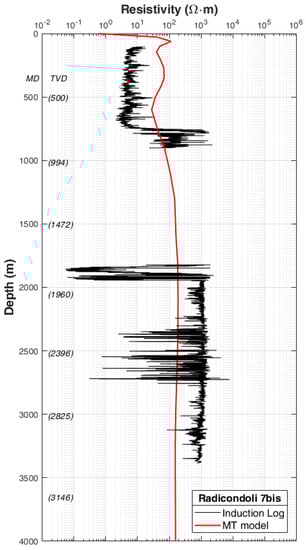 Well log resistivity (induction log M2R6) from the Radicondoli 7bis well (black line) and resistivity extracted from the 3D model (red line). On the vertical axis, MD is the measured depth and TVD is the true vertical depth. The location of the well is shown in Figure 2a.
