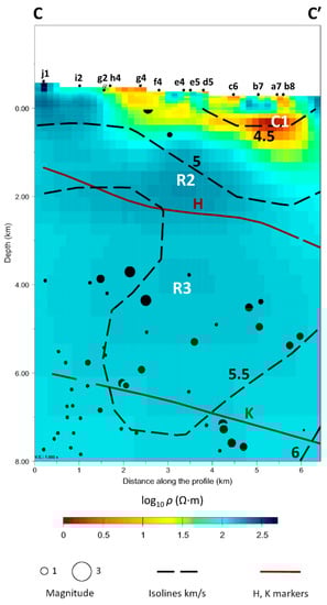 A vertical cross-section drawn from the 3D resistivity model is compared with the 3D seismic velocity model from local earthquake tomography by []. The R3 body (>140 Ω·m) and the low-velocity body with vp around 5–5.5 km/s both extend between the depths of 3 and 8 km. The trace of the cross-section is the profile CC′ in Figure 8a and it corresponds to the seismic profile CC′ of Figure 6 in []. The dashed lines represent the absolute seismic P-wave velocity (from 4.5 to 6 km/s). The red contour lines are the isodepths of the H- and K-horizons (from [] and references therein). The black circles represent the hypocenters and are proportional to the magnitude. The coordinates of the section edges are (latitude north-longitude east): 43.1667°–11.0240° (left) and 43.2124°–11.0732° (right).
