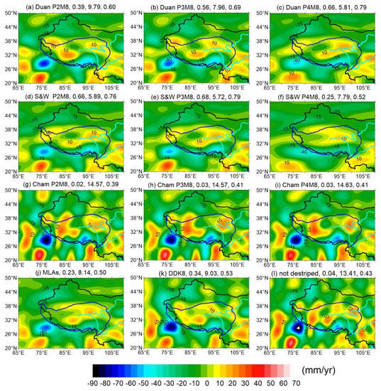 Figure 1a–f show results applying the destriping methods by Duan et al. [] and Swenson and Wahr [], respectively. Both apply moving windows of variable width. For the filters with x = 2, 3 and 4, the N-S stripes are effectively depressed in the GRACE-derived trends both inside and outside the plateau. However, better pattern and magnitude agreement of the results with the AHS (Figure 3f) is found only for ‘Duan P4M8’, ‘S&W P2M8’ and ‘S&W P3M8’, with larger PCC-values of 0.66, 0.66 and 0.68, and IOA-values of 0.79, 0.76 and 0.79, as well as smaller RMSE-values of 5.81, 5.89 and 5.72, respectively.