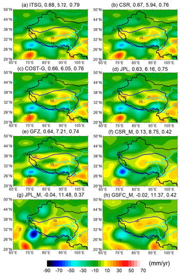 Although this paper is devoted to the determination of the GRACE-derived TWS changes inside the plateau, Figure 1, Figure 2 and Figure 4 show that the TWS changes outside the plateau also strongly vary depending on the selected destriping filters as well as GRACE solutions. It appears that our best GRACE solution-filter combinations for the area inside the plateau could still be applicable for the areas outside the plateau. Hence, determined TWS changes there, as shown in Figure 1c–e, Figure 2a,b and Figure 4a–d, would reasonably reflect the glacier melting in the surrounding mountains of the Tien Shan, Himalayas and southeast of the plateau, as well as the over-exploitation of groundwater from Northwest India to the Bengal Basin. Note that the determined TWS changes outside the plateau also have similar characteristics of patterns and magnitudes in all best GRACE solution-filter combinations.