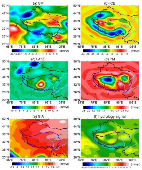 Furthermore, we identify negative signals (~25.2 mm/yr) in the Tien Shan due to increased ice melting, decreasing soil moisture, and negative signals from Northwest India (~55.0 mm/yr) to Bengal Basin (~34.0 mm/yr) due to excessive use of groundwater [], superimposing the effect of the increasing ICE melting along the Himalayas as well as soil moisture reduction there.