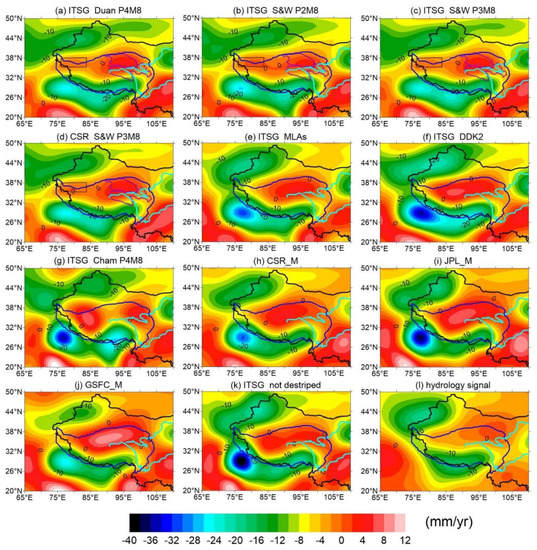 Same as Figure 1 but for some selected GRACE solutions and destriping filters smoothed by a 340-km-radius Gaussian filter (a–j), compared with the signals from the ITSG solution without destriping (k) and aggregated hydrology signals (l), but smoothed by the same Gaussian filter. The Gaussian filter is not used for ITSG+DDK2 (f), because the DDK2 filter has the smoothing characteristics of a 340-km-radius Gaussian filter according to Kusche et al. []. The purple lines in (a–d) delimit the range of the the Three-River-Source Region (below) and Qaidam Basin (above), and the dark brown rectangle represents the West Kunlun region.