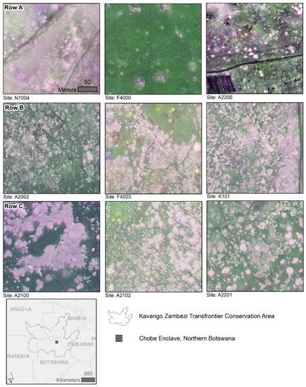 Individual sites (N = 9) for UAS flights in the study area. RGB composites shown for the Sequoia sensor (red = NIR, green = visible green, blue = red edge) for (Row A) grass-, (Row B) shrub-, and (Row C) tree-dominated landscapes in the Chobe Enclave of northern Botswana.