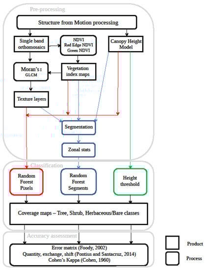 Process flow outlining data input, UAS-extracted metrics for segmentation, and the three different methods for classification: height threshold (green), RF pixel (orange), and RF segments (blue).