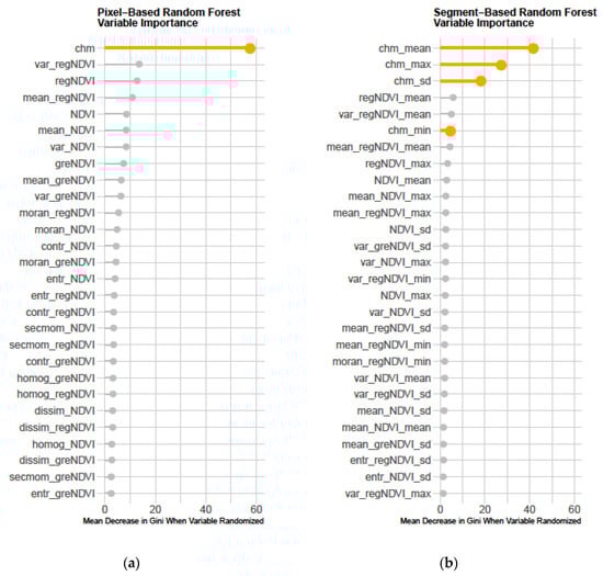 Variable importance for (a) pixel- and (b) segmented object-based RF models. Numbers represent the decrease in sorting efficiency measured by the Gini index when each variable is individually reshuffled and classes are re-predicted (we present all 28 covariates for P-RF, but the top 28 of 112 covariates for S-RF). Structural variables from the CHM are noted in orange.