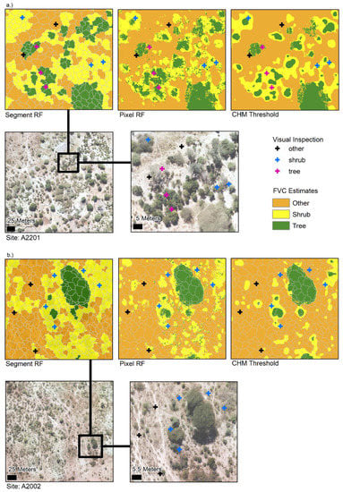 Figure 4 is a visualization from a representative of each site type (tree-, shrub-, and grass-dominated), which illustrates qualitative differences between the classification approaches. FVC estimates from each approach will naturally vary, as shown overlaid with the hand-classified points and accompanied by high-resolution imagery. Each panel in Figure 4 gives the Mavic-derived orthomosaic for the full flight extent and a zoomed-in portion of the site to highlight the overlay of visually inspected points relative to FVC-estimated land cover. The FVC surfaces are shown for each classification approach. The S-RF includes the segmented polygons overlayed in gray. Notably, for the S-RF FVC output, since it is “object-based,” the classified vegetation is more contiguous than the pixel-based approach as entire polygons are classified as a single vegetation type. These are contrasted with the simpler CHM threshold approach and its three height classes. Qualitatively, the threshold approach also produces relatively more contiguous areas than the P-RF classification.