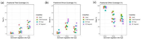 Classification approaches are compared by plotting the site-level FVC estimates from the entire classified image alongside visually hand-classified random points. Vegetation percentages of (a) trees, (b) shrubs, and (c) other by panel, by dominant vegetation site type (columns within each panel), separated by classification technique (color).