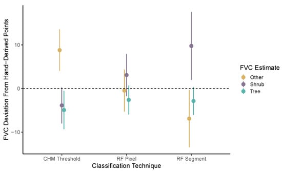 These results suggest that the pixel-based classification approach (P-RF) has the highest level of agreement with FVC estimated by hand classification of random points, across all site structural types. The CHM threshold approach tended to overestimate the amount of “other” vegetation cover, and the S-RF approach tended to overestimate the amount of “shrub” vegetation.