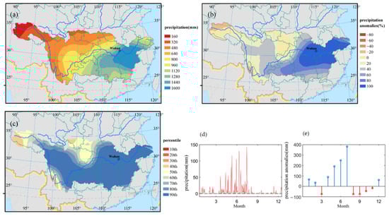(a) Precipitation across the Yangtze River valley during April–July of 1954; (b) rainfall anomaly rates across the Yangtze River valley during April–July of 1954; (c) precipitation percentile across the Yangtze River valley during April–July of 1954—the 90th percentile indicates that the precipitation in that year exceeded 90% of the years from 1951 to 1980—which can be used as the threshold of extreme precipitation events; (d) daily precipitation in Wuhan in 1954; (e) monthly precipitation anomalies in Wuhan in 1954. The data used in the figures are ground station precipitation data from 1951 to 1980. We converted the ground station data into contours based on the kriging method.