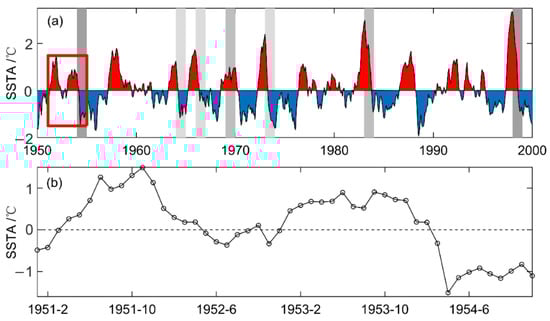Sea surface temperature anomalies (SSTAs) in the NINO3 region: (a) SSTAs from 1950 to 2000, the shadows indicate the flood disasters that may relate to the ENSO events, grayscale represents the disaster degree; (b) SSTAs between 1951 and 1954.